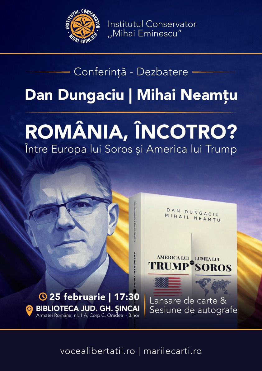 Conferința își propune să ofere un cadru de reflecție și dialog asupra direcțiilor majore în care se îndreaptă România, în contextul profundelor transformări geopolitice, culturale și strategice ale lumii contemporane. Publicul va avea ocazia să participe la un schimb de idei de substanță, susținut de două personalități marcante ale vieții și publice din România: Dan Dungaciu și Mihail Neamțu, precum și la lansarea cărții America lui Trump vs. Lumea lui Soros.